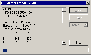 ATTENTION: incompatibilité avec le 885 :J'ai trouvé dans la rubrique "Astuces" une adresse très intéressante sur le traitement des pixels défectueux d'un APN NIKON. J'ai suivi strictement les indications du site pour "traiter" mon Coolpix 885 (même capteur que le 995) avec CCD Defects Reader v0.04 et malheureusement, le remède fut pire que le mal car, suite à cette intervention, et contrairement aux résultats satisfaisants des autres testeurs, mon appareil ne fait plus que des photos en noir et blanc, le viseur étant lui aussi en noir et blanc. J'ai bien essayé par la suite de repasser la version 0.12 (la dernière), mais rien