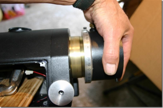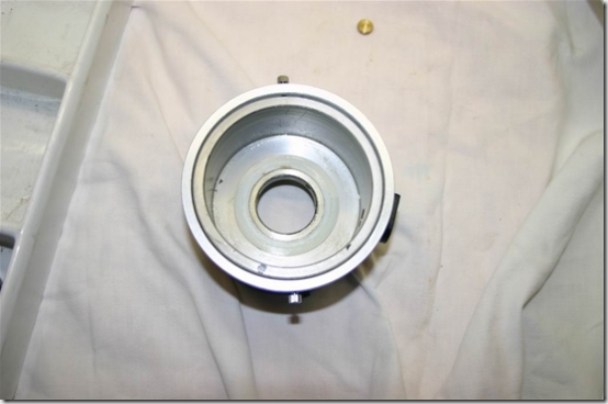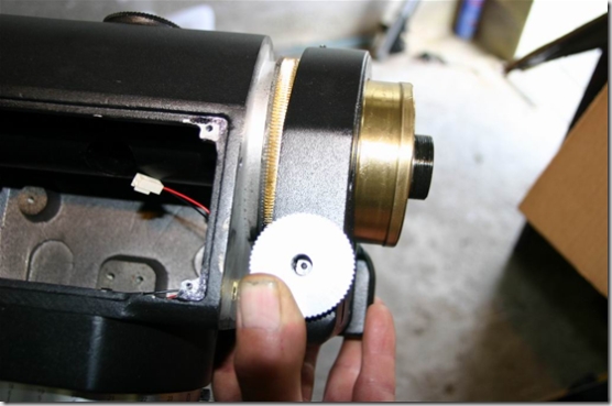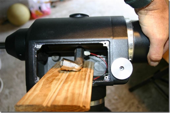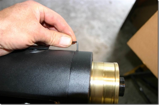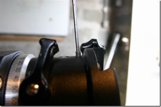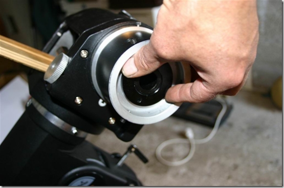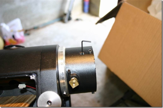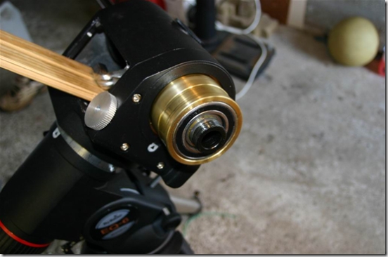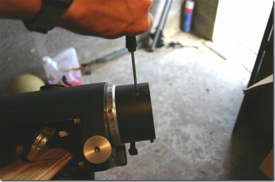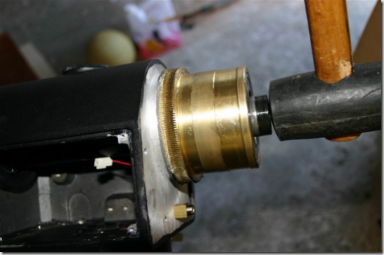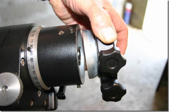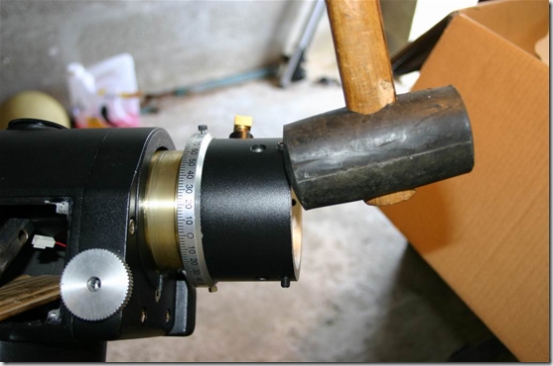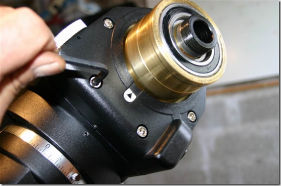5 – Pour bloquer l’axe, insérer une clé ou un tube dans le passage de visée polaire et mettre une planche pour ne pas abimer la peinture. Tourner la partie supérieure dans le sens inverse des aiguilles d’une montre, cela débloquera l’écrou central ( noir) vissé sur l’axe.