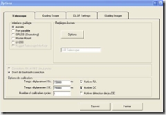Options de calibration : Indiquez ici si vous souhaitez activer/désactiver la calibration sur les axes RA et DEC ainsi que le rattrapage de jeu en DEC. Les temps de déplacement correspondent à la durée durant laquelle le télescope sera déplacé durant la phase de calibration. Ne descendez pas en dessous de 5000 ms. Avec 600mm mettre 15000ms (je dis bien 15 secondes) pour AD et DEC.