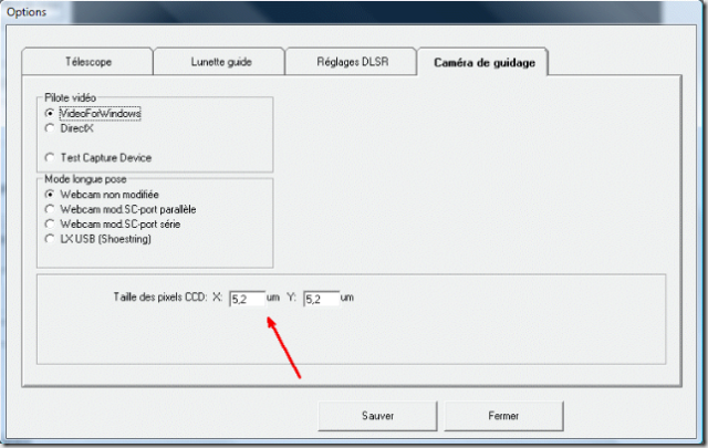 Sous « Taille des pixels CCD », indiquez la taille des pixels du CCD en microns.