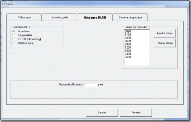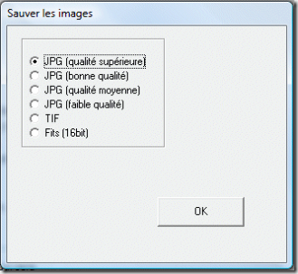 Cette option permet de sauvegarder les images de la webcam dans le format JPEG, TIF ou FITS. Atttention, le disque dur se remplit bien vite.