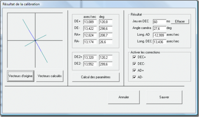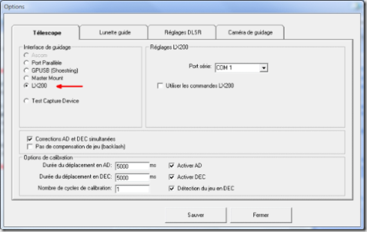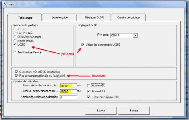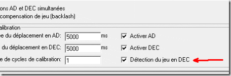 Options de calibration : Indiquez ici si vous souhaitez activer/désactiver la calibration sur les axes RA et DEC ainsi que le rattrapage de jeu en DEC. Les temps de déplacement correspondent à la durée durant laquelle le télescope sera déplacé durant la phase de calibration. Ne descendez pas en dessous de 5000 ms. Avec 600mm mettre 15000ms (je dis bien 15 secondes) pour AD et DEC.