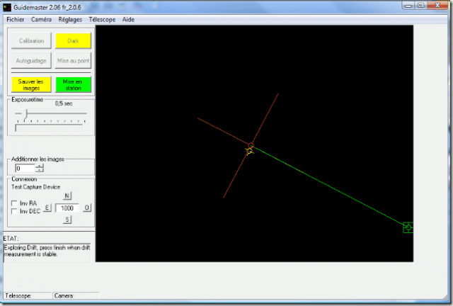 Quand le sens de la dérive est bien évident, lance le guidage. Le logiciel va essayer de ramener l’étoile à son point de départ. Observer les carrés verts de direction N et S. Regarder lequel s’allume. Désactiver la correction sur le sens qui ne s’allume pas. Très important: le rattrapage de jeu en autoguidage c’est mission impossible.