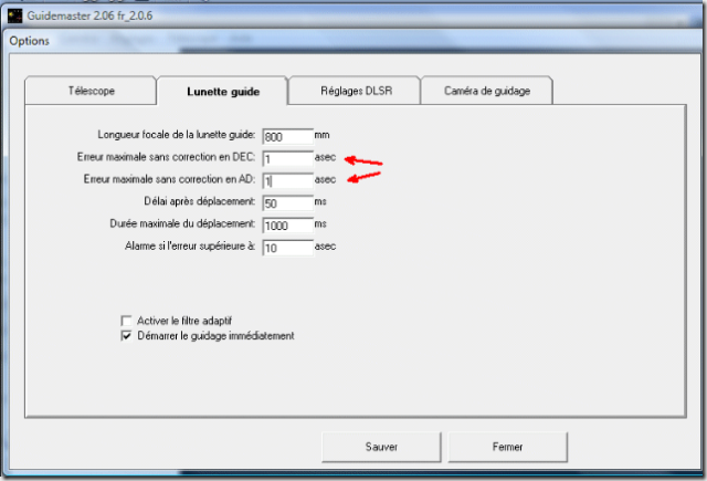 Corrections AD et DEC simultanées : si votre monture n’est pas capable de gérer les corrections simultanées, désactiver cette option.