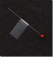 Les épingles à tête ronde que j’ai utilisées mesurent 3.8cm de long. J’ai dû allonger une des tiges pour placer l’étoile Lalande 21185. Voici comment il faut s’y prendre. En tenant fermement une épingle avec des pinces, on peut facilement enlever la tête ronde. Il suffit de prendre cette épingle sans tête pour faire la rallonge. Regarde la photo, la rallonge et l’épingle sont maintenues ensemble à l’aide d’une bande de ruban adhésif.