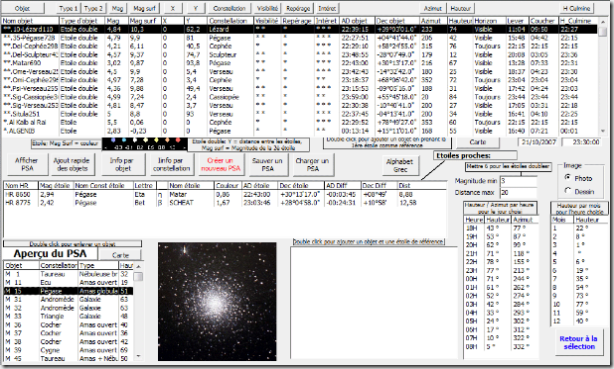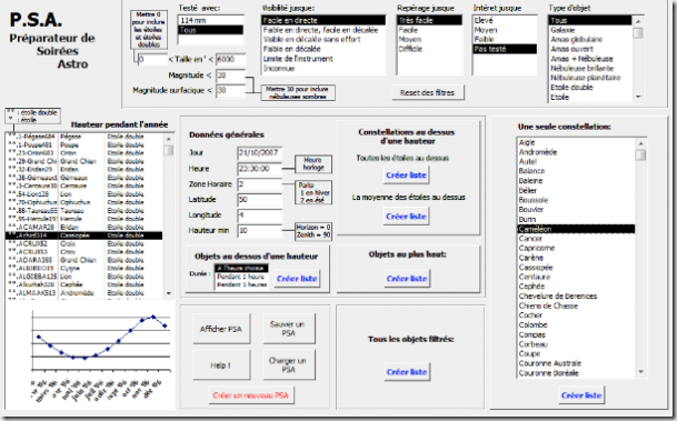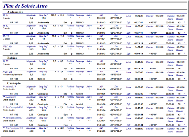 Ce logiciel permet de préparer une liste d’objets selon des critères de visibilité, de repérage, de hauteur dans le ciel… La base générera alors un « Plan de Soirée Astro » sauvegardable et chargeable ultérieurement.
