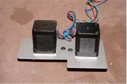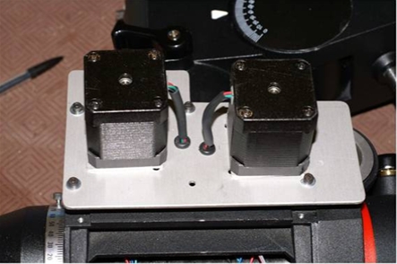 - Les moteurs sont ensuite fixés sur la plaque de soutien par 4 vis M3 de longueur 10mm. Les vis auront si possible une tête six pans de manière à pouvoir facilement les serrer lorsque la plaque de soutien sera en place sur la monture, ces vis serviront à régler la tension des courroies moteurs.