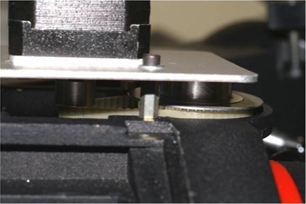 - Pour effectuer la tension de courroies, il faut desserrer un petit peu les 4 vis de fixation de chaque moteur. Ensuite on règle la tension des courroies en bougeant le moteur. Un fois le réglage trouvé, on démontera doucement la plaque du bâti puis on serrera définitivement les vis des moteurs.
