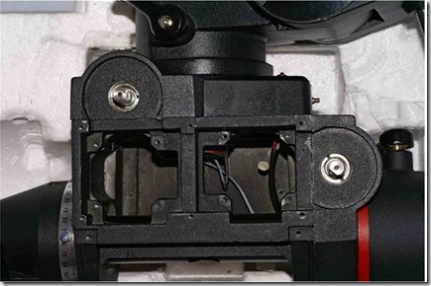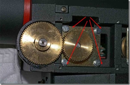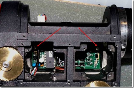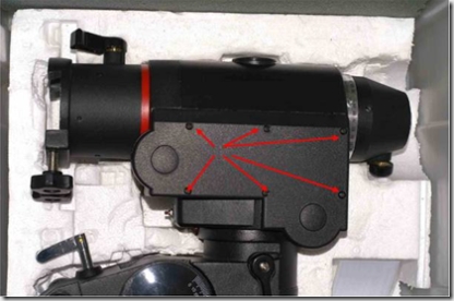 - Enlever le cache noir, protégeant le viseur polaire et l’électronique de commande (flèches rouges), deux vis de chaque coté du capot.