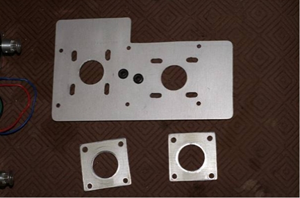 Il faut découper 3 plaques d’aluminium. Une épaisseur de 2mm est suffisante pour assurer une très bonne rigidité. Il faut percer d’abord tous les trous des plaques, puis seulement ensuite les découper (scie sauteuse)
