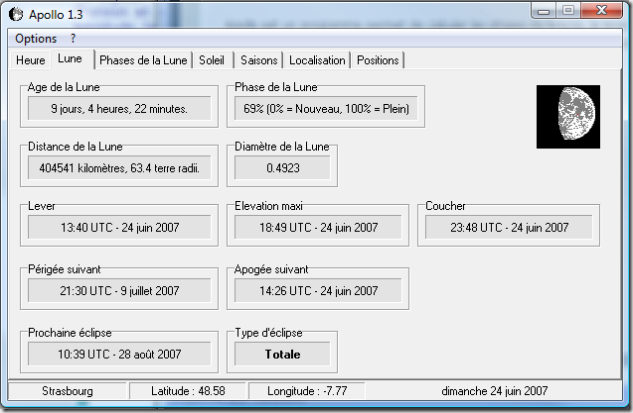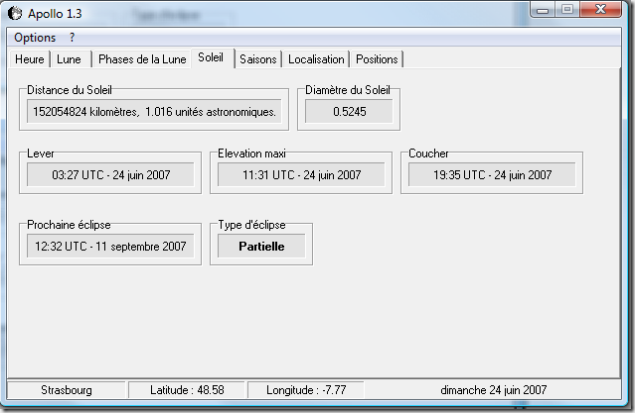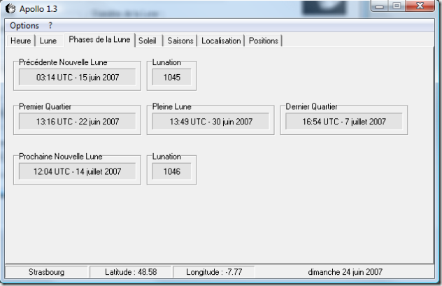 Apollo est un programme permet de calculer les phases de la lune, le lever et coucher du soleil, les éclipses…. Il donne aussi la liste la position (latitude et longitude) des principales villes du globe.