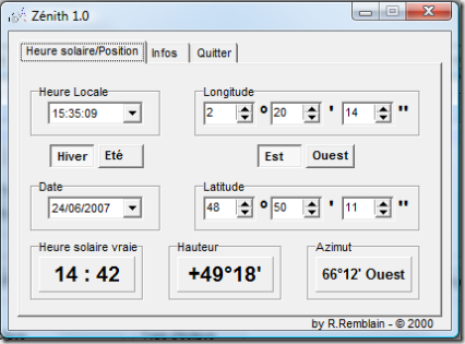 Zénith se propose de donner l’heure solaire, la hauteur (angle vertical entre l’horizon et le centre du soleil) et l’azimut (angle horizontal entre le sud et le centre du soleil). Ces valeurs varient en fonction de la longitude, la latitude, la période de l’année et la date.