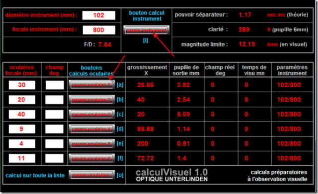 Ensuite entrer diamètre et focale de l’instrument pour calculer les paramètres de l’instrument.