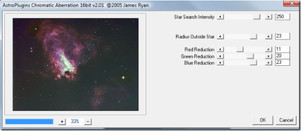 Réduit l’abération chromatique des images en recherchant les étoiles et en réduisant leur halo coloré.