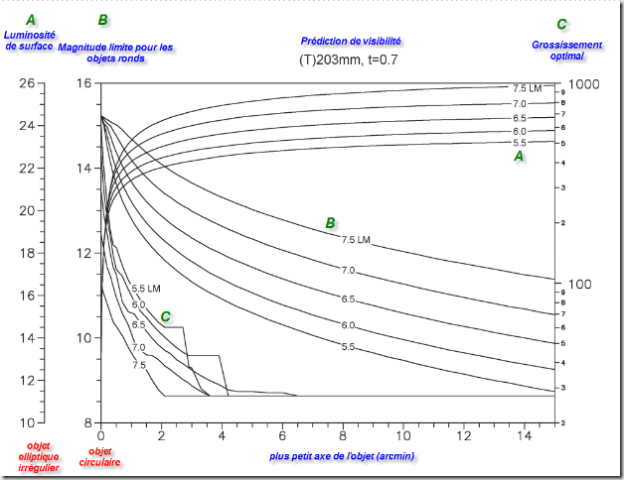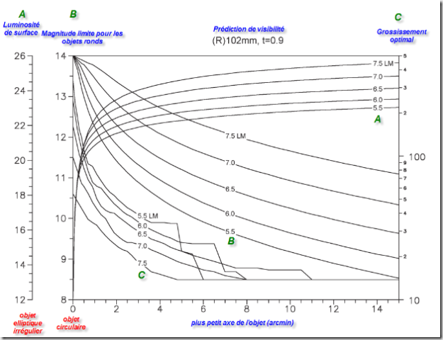 Deux graphes permettant de prévoir si un objet sera visible dans une FS102 et un C8 (les 2 instruments que je possède)