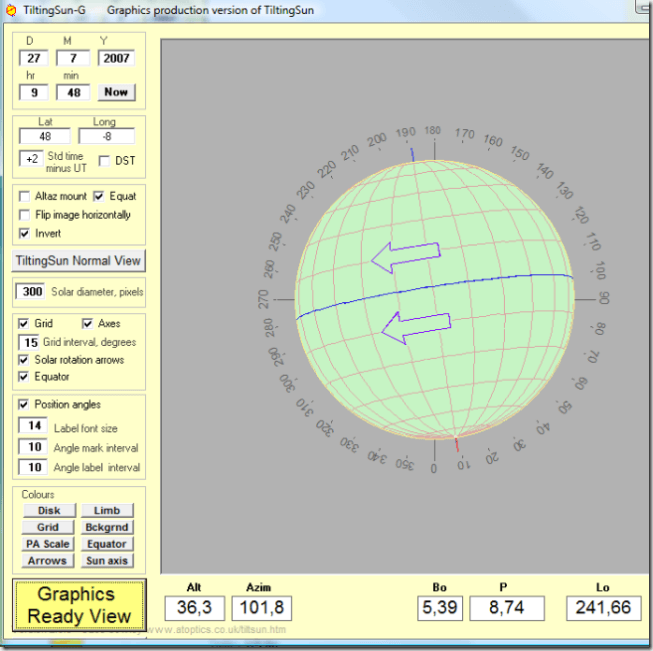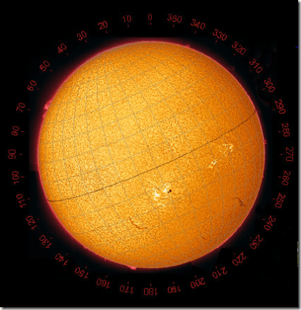 Dans le cadre d’un AE (accompagnement éducatif), j’étais à la recherche d’une grille du Soleil. L’objectif est de mesurer la période de rotation du Soleil. Le problème que j’avais est que les élèves inscrits sont essentiellement en sixième. Nous avons donc fait des photos avec un téléobjectif 300 mm et un APN EOS 350D. Mais difficile, par exemple, de faire comprendre à cet âge, comment réorienter les images. Avec TiltSun, le problème est levé. Date, heure, et coordonnées rentrées; il ne reste plus qu’à superposer avec l’original. (Par exemple, sous iMerge). Les mesures d’angles deviennent alors très abordables.