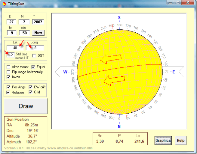 Une fois saisis latitude, longitude et fuseau horaire, cliquez sur DRAW.