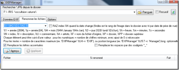 D’autre part, dans le deuxième onglet, il est possible de renommer automatiquement tous les fichiers des images à partir des données EXIF, un peu comme on peut le faire avec des fichiers MP3 à partir des Tags qu’ils contiennent.