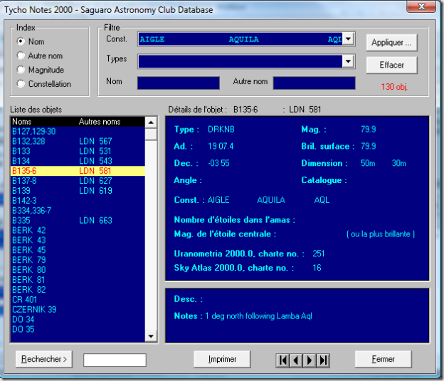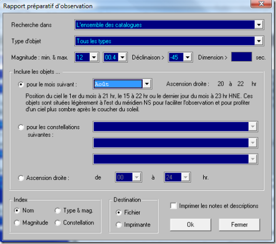 Vous choisirez alors les catalogues de recherche, le type d’objet, la magnitude limite, le mois d’observation etc
