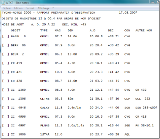 L’utilitaire Rapport préparatif est l’outil idéal pour préparer vos soirée d’observation. Il produit des listes d’objets du ciel profond à observer selon le mois, les constellations ou l’ascension droite avec les magnitudes et la déclinaison de votre choix.