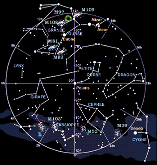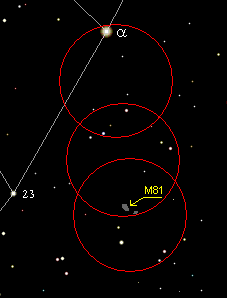 Pour repérer M81, tracez une ligne imaginaire passant par les étoiles γ et α. Reportez la distance entre ces deux étoiles comme indiqué sur les dessins ci-dessus. Vous trouverez sans grande difficulté la galaxie M81 à condition d’observer sur un site éloigné des lumières parasites des grandes villes.