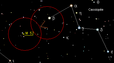 Prenez l’étoile β de la constellation de Cassiopée comme premier point de repère. Vous apercevrez une formation de six étoiles en forme de V (voir le dessin ci-dessus, repéré en orange). Cette formation d’étoiles, vous indique la direction à suivre pour trouver M52.