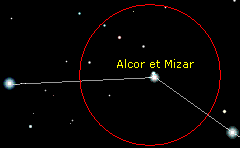 Alcor et Mizar se trouvent dans la constellation de la Grande Ourse. Elles sont visibles à l’oeil nu, c’est un bon exercice pour tester sa vue. Alcor et Mizar sont des doubles optiques. La brillante Mizar a une magnitude de 2,4 et Alcor de 4.