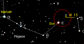 Vous repérerez facilement la constellation de Pégase grâce à la constellation de cassiopée. Vous trouverez M15 en pointant vos jumelles sur l’étoile Enif, l’amas globulaire sera dans le champ de vos jumelles.