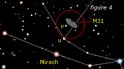 Pointer cette étoile afin de repérer une troisième étoile (v) (figure3).Reprenez ce dernier point de repère, déplacer légèrement vos jumelles; la galaxie Andromède se trouve un peu plus haut sur la droite (figure 4).