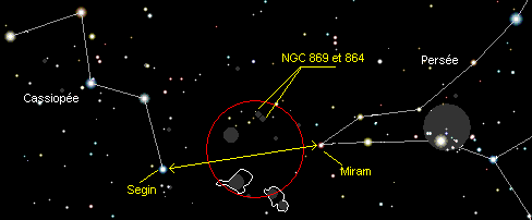 « Segin » et « Miram » le double amas se situe pratiquement au centre de ces deux étoiles.