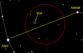 M34 se situe entre l’étoile Algol de Persée et Alamak d’Andromède.