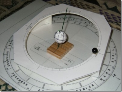 - d’une petite sphère mappemonde sur laquelle sont dessinés les continents, les méridiens et des parallèles, avec son axe de rotation et supportée par un petit socle avec la bonne inclinaison de la Terre sur l’écliptique.