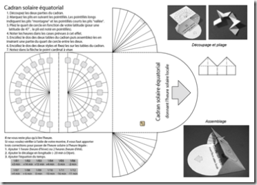 Ce cadran se construit à partir d’une feuille type bristol en format A4. Il peut être réglé pour n’importe quelle latitude : il suffit de plier correctement une des parties du cadran pour que la table face un angle avec l’horizontale égal au complémentaire de la latitude (43° pour une latitude de 47°…). Le pliage pour 47° est d’ailleurs noté.