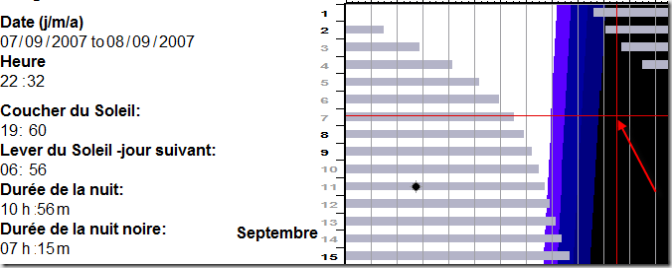 En cliquant sur le graphique, on fait apparaître deux axes rouges qui précisent l’heure pointée, l’heure de coucher et de lever du Soeil, la durée de la nuit noire