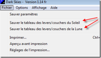 Le menu fichier permet enfin de sauvegarder au format txt les heures de lever et de coucher de la Lune et du Soleil. Les fichiers sont générés dans le répertoire de Dark Skies.