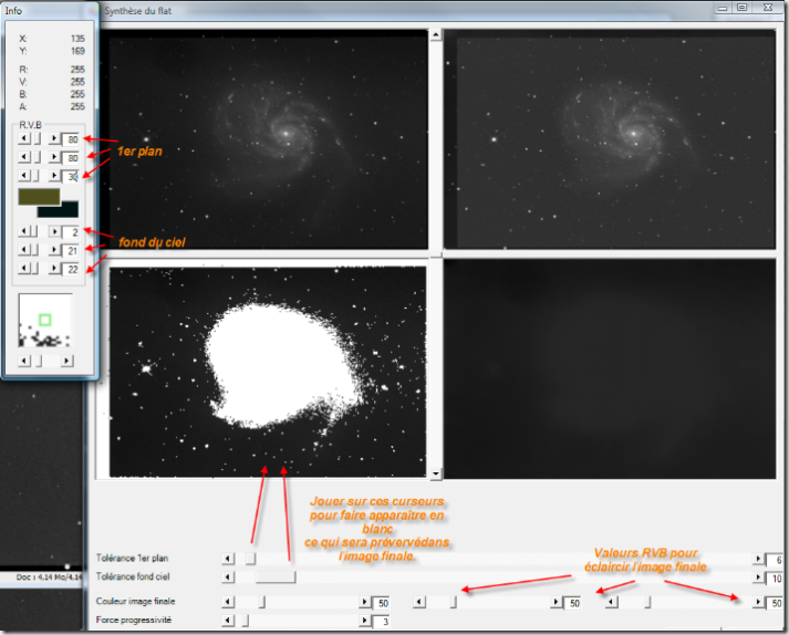 Jouer sur les curseurs du panneau d’informations pour isoler la nébuleuse et les étoiles lumineuses dans la zone bien blanche du masque. Ce qui sera en blanc sera préservé.
