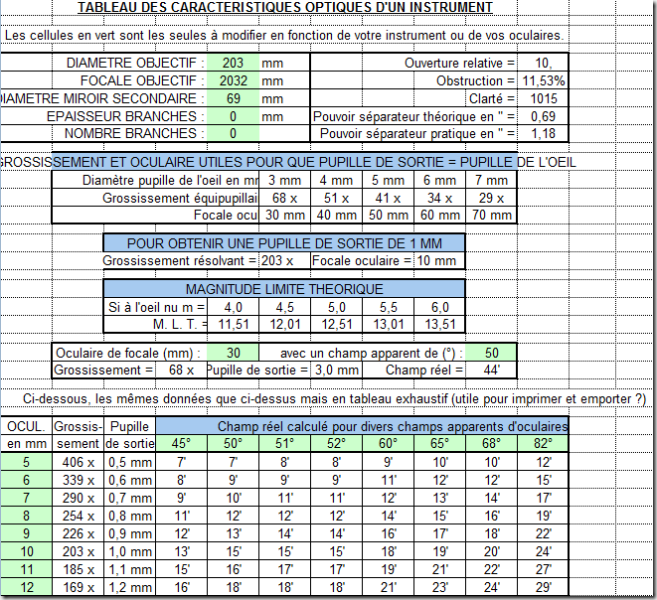 Une feuille de calcul Excel qui donne les caractéristiques optiques principales de n’importe quel télescope.
