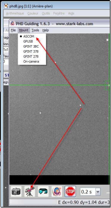 1: choix de l’autoguideur, réglage du port com et des paramètres de vitesse et d’images de l’autoguideur