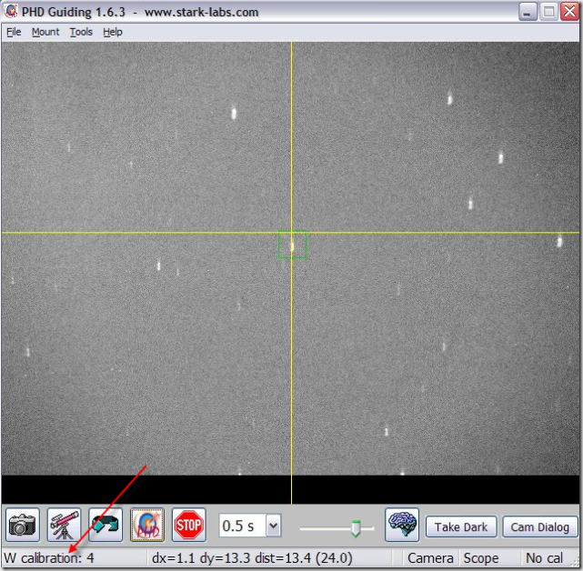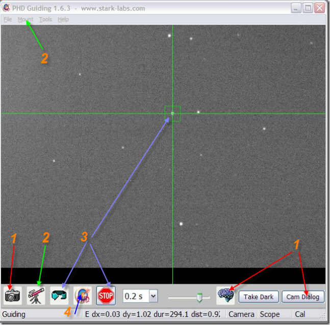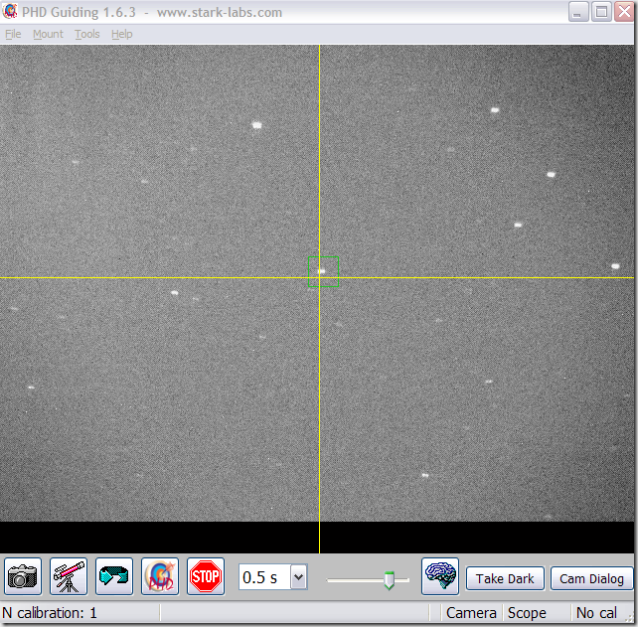 Une fois terminé et sans action de votre part, l’autoguidage commencera et sera matérialisé par deux axes verts et un carré orange.![]()