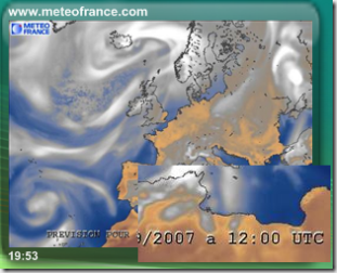 La carte provient de Météo France et affiche la prévision pour le midi suivant TU.