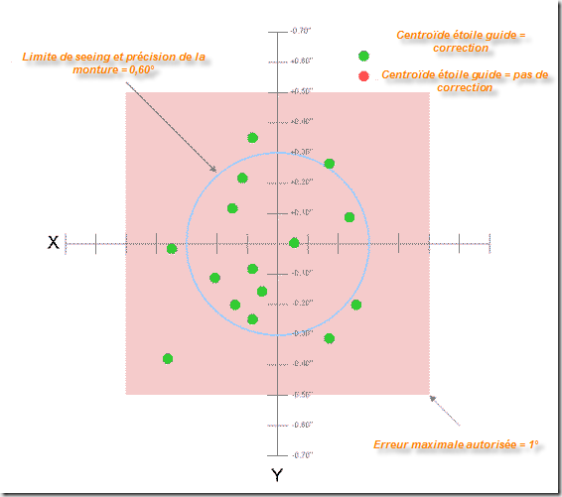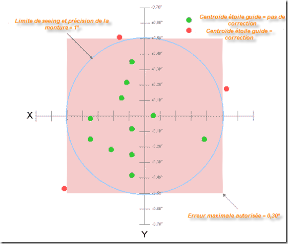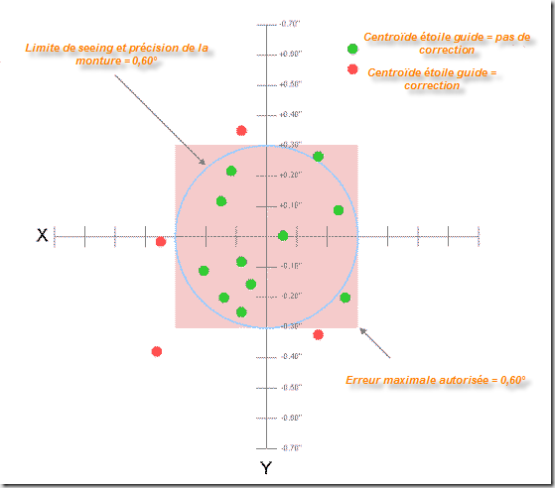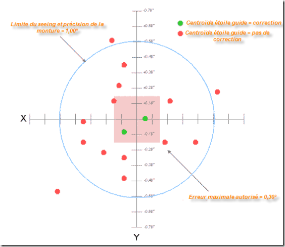 Ici nous avons un exemple de l’erreur maximale permise qui est élevée. Ceci peut être le cas d’une nuit excellente voir ou une monture plus précise. Comme vous pouvez voir, la centroïde de l’étoile guide est en dehors des possibilités du système et ne sont pas corrigés.