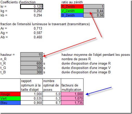 Vous devrez saisir les données des cases grises et vous obtiendrez les facteurs avec lesquels il faudra multiplier les images vertes et bleues.