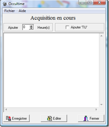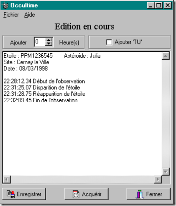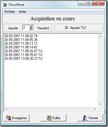 Le message ‘Acquisition en cours’ est affiché en haut de la fenêtre. Tant que ce message est affiché, chaque appui sur une touche quelconque du clavier provoque l’ajout d’une ligne supplémentaire dans l’éditeur de texte. Cette ligne contient la date et l’heure où la touche a été appuyée. La précision de cette heure dépend de l’heure CMOS de l’ordinateur. Si vous souhaitez indiquer l’heure en temps universel, le champs ‘Ajouter XX heure(s)’ permet de corriger automatiquement les instants enregistrés. Si l’option ‘Ajouter TU’ à été cochée, les deux lettres TU sont ajoutées à côté de l’heure. Ces options sont sauvegardées dans le fichier ‘Occultime.ini’.