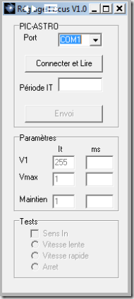 RéglageFocus est un logiciel sous Windows Réglage de Focus à utiliser avec la V2_40D2A. Cela doit permettre d’ajuster les paramètres de la partie Focus sans avoir à télécharger des fichiers de paramétrage. Son utilisation est simple, il suffit d’ajuster les paramètres V1,Vmax et maintien puis d’appuyer sur le bouton « envoi » pour les charger dans PIC-ASTRO. Ces paramètres sont pris en compte instantanéement et donc testables avec le PAD et pour contrôler, il est possible d’envoyer les commandes LX200.
