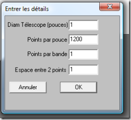 avec le diamètre du télescope en pouces, le nombre de points par pouce de l’imprimante, le nombre de points dans l’épaisseur d’une bande, l’espacement.