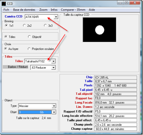 Il faudra choisir votre CCD ou votre capteur et votre instrument (télescope/lunette ou téléobjectif) ainsi qu’éventuellement si vous utilisez une barlow ou un réducteur.