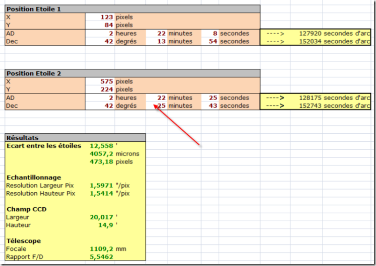 Cette feuille permet de calculer l’écart réel entre 2 étoilies, l’échantillonage et le champ.