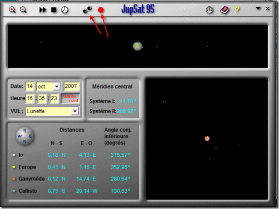 L’interface permet d’afficher le diagramme des satellites (en fonction de l’instrument) et le méridien de la Grande Tache Rouge.