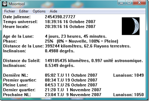 Voici un petit programme bien pratique qui donnent de nombreuses informations sur la Lune.