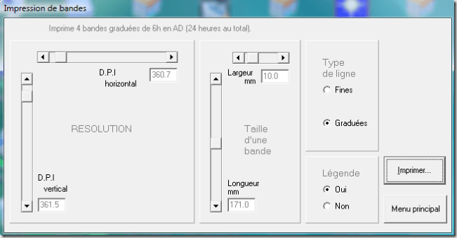 Ensuite, vous pourrez choisir d’imprimer 4 bandes de 6h à coller sur votre axe horaire avec ou sans légende …